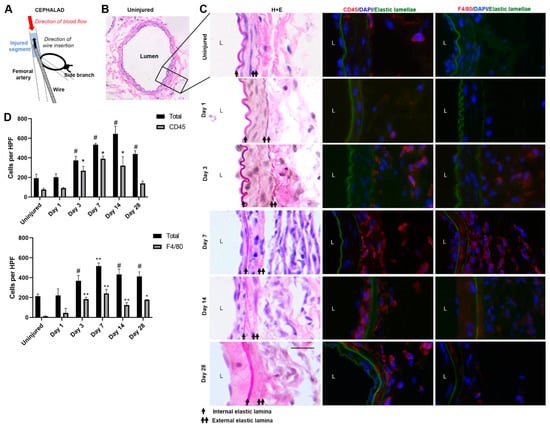 Arterial morphometry of uninjured and injured arteries was assessed by hematoxylin and eosin staining, as shown in Figure 1B,C. As shown in Figure 1C,D, overall leukocyte (CD45) and macrophage (F4/80) infiltration increased starting 1 day after injury, peaked 7 days after injury, and declined between days 7 and 28. Peak inflammatory infiltration occurred prior to the peak neointimal hyperplasia lesion at day 28 (Figure 1C).