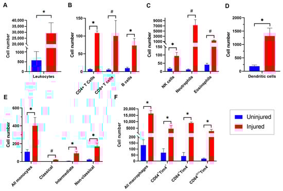 Comparison of leukocytes and leukocyte sub-populations identified using high-parameter flow cytometry in uninjured arteries and in femoral artery samples 3 days after injury. Comparisons are in numbers of live leukocytes (A), B and T lymphocytes (B), natural killer (NK) cells, neutrophils, and eosinophils (C), dendritic cells (D), monocytes and monocyte subpopulations (E), and macrophages and macrophage subpopulations (F). Each bar represents the mean cell number ± SEM of at least 3 samples, each comprising 2 arterial segments. p values calculated using Student’s t-test. CM, classical monocytes. IM, intermediate monocytes. NC, non-classical monocytes. * p = 0.007, # p = 0.004.