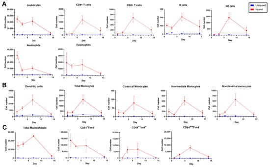 Leukocyte and leukocyte sub-population infiltration in uninjured arteries and at 1, 3, 7, and 14 days after injury using the high-parameter flow cytometry panel. Line graphs show all leukocytes, lymphocytes, neutrophils, natural killer (NK) cells, and eosinophils in injured and uninjured arteries (A), dendritic cells, monocytes, and monocyte sub-populations (B), and macrophages and macrophage subpopulations (C).