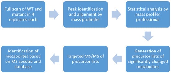 As shown in Figure 1, this workflow starts with a full-scan of WT and mutants using a U(H)PLC–QTOF instrument (6545, Agilent Technologies, Waldbronn, Germany). After data processing with Mass Profinder (Agilent Technologies) and Mass Profiler Professional (Agilent Technologies), precursor lists were generated including significantly changed metabolites. These precursor lists were applied to targeted MS/MS analyses to obtain the spectral information of the interested metabolites. Metabolites were identified by searching the spectra in the supplied library (Agilent Technologies) as well as from the literature.