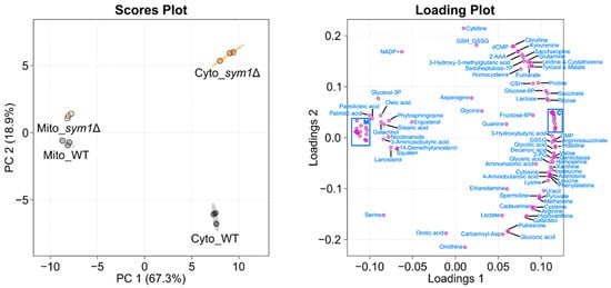 Principal Component analysis (PCA) score plot (left) and its loading plot (right). PC1 discriminates mitochondria (Mito) from the cytoplasm (Cyto), while PC2 discriminates sym1Δ from WT. The PCA loading plot shows how the individual metabolites contributes to the discrimination of groups. For readability, closely spaced metabolites only discriminating component 1 were not labeled but blue-rimmed. These were present in the C-cluster: 3-phosphoglyceric acid, alanine, AMP, aspartate, citrate, glutamate, Mannose-6P, phosphoenolpyruvate, threonine, trehalose, tryptophan, tyrosine, and UMP; and in the M-cluster: 1-monopalmitin, 1-octadecanol, 5-methyluridine, adenine, dCytidine, eicosanoic acid, ergosterol, glucose, hexacosanoic acid, lauric acid, maltose, methylphosphate, myo-inositol, myristic acid, NAD+, O-phosphocolamine, and pyroglutamate. N = 3.