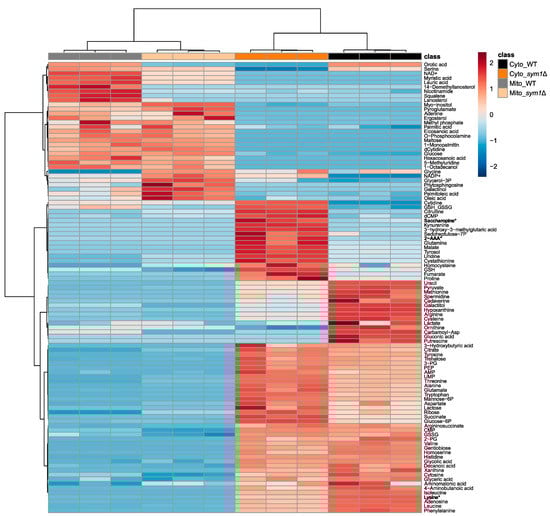 Heat map of significantly altered metabolites in mitochondria (Mito) and cytoplasm (Cyto), isolated from BY4741 (WT) and sym1Δ cells. Lysine biosynthesis intermediates, 2-aminoadipate and saccharopine, and lysine are highlighted in bold style with asterisk. Auto-scaled z-scores are displayed. Samples and metabolites were clustered with Ward’s method and Euclidean distance measure. N = 3.