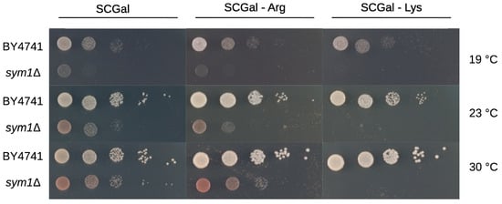 Growth test of BY4741 and sym1Δ on SCGal plates at 19, 23, and 30 °C for five days. BY4741 and sym1Δ were incubated on SCGal plate with full amino acids (left), without arginine (middle), and without lysine (right).