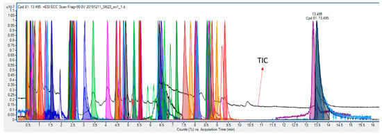 An example of a total ion chromatogram (TIC) with extracted chromatograms of compounds.