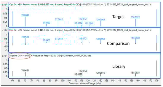 Identification of arginine through library search. The identification of metabolites was done by searching library with mass spectral information.