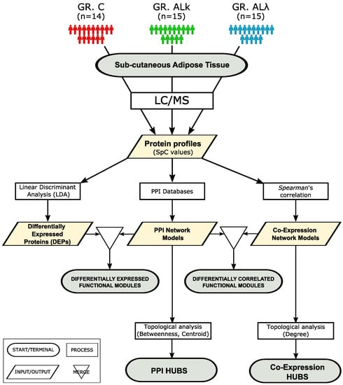 Workflow applied to investigate, at the proteomic system level, abdominal sub-cutaneous adipose tissues from control subjects (C, n = 14) and patients affected by AL (AL, n = 15) and AL (AL, n = 15) amyloidosis.