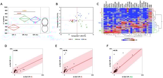 A preliminary functional evaluation of the characterized protein profiles was performed by functional annotation tool contained in STRING database []. For each subject, enriched Reactome pathways were retained (FDR ≤ 0.05) []. They were compared by linear discriminant analysis (LDA) and those with F ratio ≥5 and p-value ≤ 0.01 were selected as differentially enriched among C, AL and AL groups.