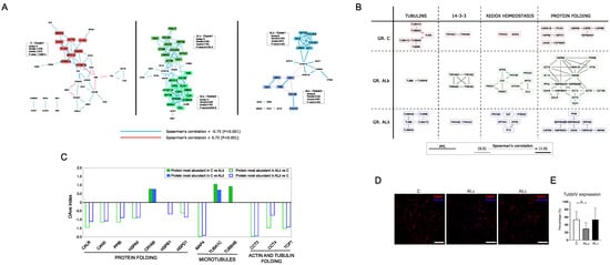 Besides the analysis of node communities, the merging of the PPI and co-expression models was performed with the aim of clarifying the question of whether proteins that are part of protein complexes and/or biological processes are also correlated in maintaining a well-defined stoichiometry. Therefore, the question of how to interpret the correlation loss or gain arises. Following these tracks, we spotted some protein complexes whose correlation changed from C to AL and AL groups (Figure 4B). In particular, the AL group showed a significant decrease in correlation among tubulins, whereas, in the AL group, the same phenomenon was observed for the 14-3-3 proteins complex. These variations were associated with an increased correlation of proteins physically interacting and functionally involved in the redox homeostasis/detoxification of reactive oxygen species and protein folding/stress response. Their increase was much more marked for the AL group, where the protein folding/stress response module was featured by the presence of different subunits belonging to the T-complex protein ring complex (TRiC). As TRiC is involved in tubulin folding, our attention was captured by the opposite trend of expression between its components (CCT3, CCT4, TCP1) and tubulin subunits (TUBA1C, TUBB4B) (Figure 4C–E and Supplementary Figure S2). In fact, this suggests a potential non-random correlation of events worthy of further future investigation. In addition, except for the alpha-crystallin B chain (CRYAB), other folding-related proteins were more abundant in AL and AL tissues, confirming a role of the endoplasmic reticulum (ER) in systemic amyloid diseases [].
