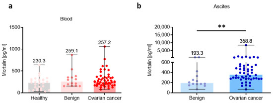 Mortalin profile in the peripheral blood and local ascites tumor environments. Soluble mortalin levels were measured (a) in the blood plasma from cohorts of healthy, benign ovarian tumors patients, and ovarian cancer patients, and (b) in the ascites fluid from cohorts of benign ovarian tumors patients, and ovarian cancer patients. Bars represent medians and ranges. Significant differences between study groups are marked using asterisks: ** p < 0.01.