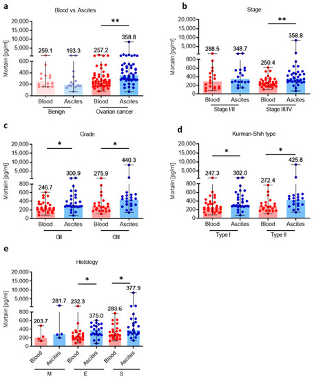 Comparative analysis of mortalin in the blood plasma and accompanying ascites fluid. The levels of mortalin in the blood plasma and ascites fluid from patients with ovarian cancer and benign ovarian tumors (a). The levels of blood plasma and ascites fluid mortalin in ovarian cancer patients with different clinicopathologic characteristics, i.e., stage (b), grade (c), Kurman–Shih type (d), and histology type (e). Bars represent medians and ranges. * p < 0.05, ** p < 0.01. E—endometrioid OC; M—mucinous OC; S—serous OC.