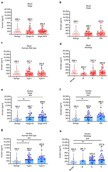 Mortalin profile in patients with different clinicopathologic characteristics. Mortalin levels in patients with benign ovarian tumors and ovarian cancer with different stage (a), grade (b), Kurman–Shih type (c), and histology type (d) in the blood plasma. Mortalin levels in patients with benign ovarian tumors and ovarian cancer with different stage (e), grade (f), Kurman–Shih type (g), and histology type (h) in the ascites fluid. Bars represent medians and ranges. * p < 0.05, ** p < 0.01. E—endometrioid OC; M—mucinous OC; S—serous OC.