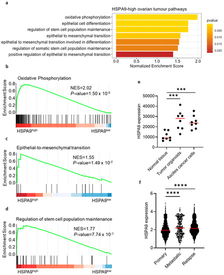 Next, we attempted to validate our observations that mortalin can promote OC pathogenesis. Using human serous OC scRNA-seq data, GSEA demonstrated enrichment of several cancer-related gene pathways in OC with high mortalin (HSPA9) expression (Figure 4a). These pathways included oxidative phosphorylation (OXPHOS) signaling (Figure 4b, EMT signaling (Figure 4c), and stemness maintenance (Figure 4d). In concordance with this, mortalin was correlated with OXPHOS-related genes (CYCS, COX5B, COX8A, SDHD, and ATP5F1B) (Figure S3a) and EMT stemness-like related genes (STK3, STK4, PAX2, PAX8, CD24, SNAI1, SNAI2, MYC, TWIST2, and BMP7) (Figure S3b). Therefore, mortalin expression can regulate functional potency and aggressiveness of OC cells. Indeed, mortalin gene expression was upregulated in the malignant fluid of serous OC, including tumor-derived organoids (cultured) and malignant effusion cells (no cultured) compared to normal ovarian tissues (p < 0.001, Figure 4e). Moreover, the mortalin gene was highly expressed in metastatic and relapse tumors compared to primary tumors in HGSOC patients (p < 0.0001, Figure 4f). Collectively, the results supported that mortalin can support worse clinical outcome.