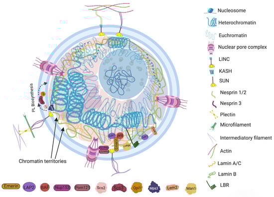 The organization of the genome within the nucleus is a nonrandom process. The second level arrangement of the genome contains euchromatin and constitutive or facultative heterochromatin that gives rise to some advanced assemblies, such as chromosome loops, topological associated domains (TADs, fundamental units of three-dimensional (3D) nuclear organization), lamin associated domains (LADs, heterochromatin located adjacent to lamina), nucleolar associated domains (NADs, heterochromatin located adjacent to the nucleolus) and chromosome territories. It is also known that the nuclear arrangement of chromatin is somehow related to the morphology of the nucleus [58,74]. The role of chromatin in sizing and shaping the nucleus is very intricate and diverse. However, it is widely understood that chromatin contributes to nuclear morphological regulation by (i) interacting with nuclear envelope via the LAD/NAD binding domains of INM integrated proteins and (ii) altering the biophysical properties of heterochromatin.