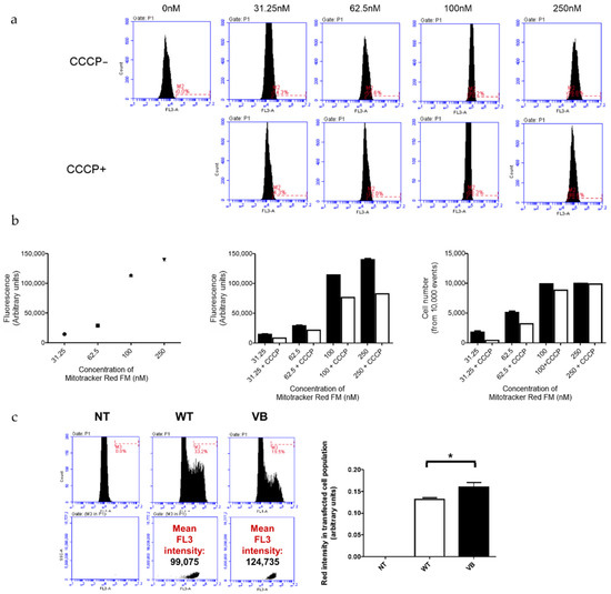 Analysis of mitochondrial membrane potential (Δψm) in ARPE-19 cells transfected with WT and variant B (VB) cystatin C EGFP fusion constructs. (a) Evaluation of optimal Mitotracker Red FM concentration required to stain the entire ARPE-19 cell population (+/− CCCP, an uncoupling agent that disrupts oxidative phosphorylation). Concentrations used for optimization ranged between 0–250 nM. Flow cytometry utilizing the FL3 channel was used for analysis. (b) Graphs show FL3 fluorescence intensity for cells stained with different concentrations of Mitotracker Red FM (left = optimization line graph; middle = +/− CCCP optimization bar graph; and right = number of cells stained with the concentration range of Mitotracker Red FM +/− CCCP). (c) Flow cytometry analysis of ARPE-19 cells transfected with EGFP WT or variant B cystatin and stained with Mitotracker Red FM. After P1 gating was performed to exclude dead cells and debris (not shown), M1 (green channel) histograms were used to measure transfection efficiency (left). The M1 population was then selected to measure red intensity (FL3), as shown by middle and right plots. Graph shows red fluorescence intensity (FL3 channel) in the transfected (green; FL1 channel) cell population (arbitrary units ± S.E.M. minimum of n = 3; Student’s t test * p ≤ 0.05).