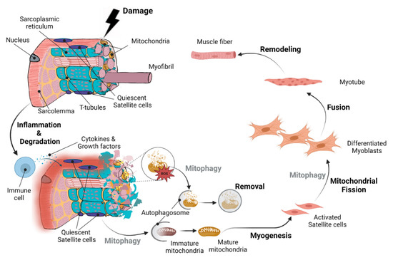 Chatzinikita, E.; Maridaki, M.; Palikaras, K.; Koutsilieris, M.; Philippou, A. The Role of Mitophagy in Skeletal Muscle Damage and Regeneration. Cells 2023, 12, 716. https://doi.org/10.3390/cells12050716