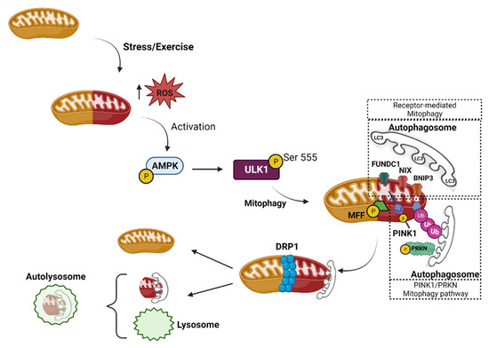 - Laker, R.C.; Drake, J.C.; Wilson, R.J.; Lira, V.A.; Lewellen, B.M.; Ryall, K.A.; Fisher, C.C.; Zhang, M.; Saucerman, J.J.; Goodyear, L.J.; et al. Ampk phosphorylation of Ulk1 is required for targeting of mitochondria to lysosomes in exer-cise-induced mitophagy. Nat. Commun. 2017, 8, 548. [Google Scholar] [CrossRef] [PubMed]