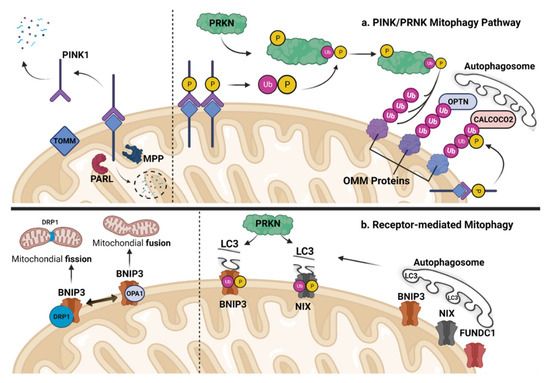 - Palikaras, K.; Lionaki, E.; Tavernarakis, N. Mechanisms of mitophagy in cellular homeostasis, physiology and pathology. Nat. Cell Biol. 2018, 20, 1013–1022. [Google Scholar] [CrossRef] [PubMed]
