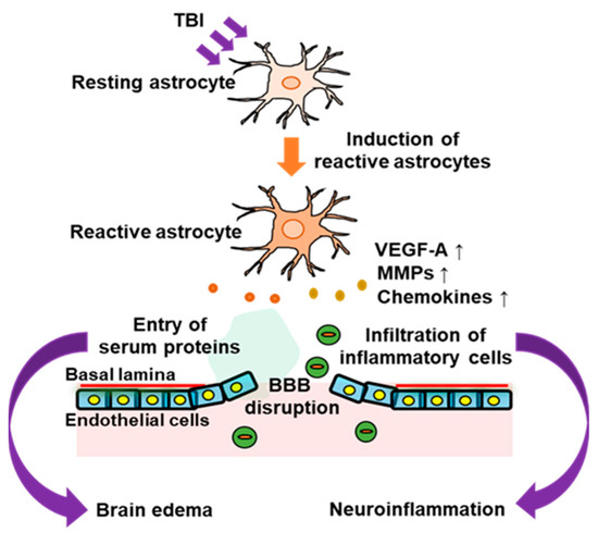 Involvement of astrocytes in BBB disruption in the acute phase of traumatic brain injury (TBI). In the acute phase of TBI, activation of astrocytes occurs around the damaged brain area. The astrocytic activation is accompanied by increased expressions of astrocyte-derived vascular permeability factors, such as vascular endothelial growth factor-A (VEGF-A), matrix metalloproteinase 9 (MMP9), and chemokines. This impairs the barrier function of the blood–brain barrier (BBB) and allows entry of inflammatory cells and serum proteins into the brain parenchyma, which leads to neuroinflammation and brain edema.
