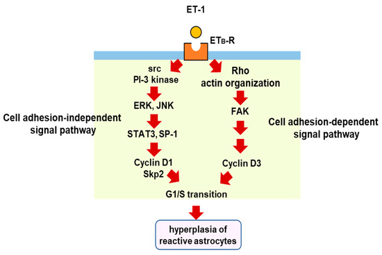 The proliferation of reactive astrocytes is regulated by multiple intracellular signaling pathways. Several studies have suggested that signal transducer and activator of transcription 3 (STAT3) is a key transcription factor for astrocytic proliferation in brain injury [73,74,75]. Selective nuclear localization of phosphorylated STAT3 in reactive astrocytes was observed in the cerebrum of TBI model rats [76]. We also found that phosphorylated STAT3 increased in the cerebrum of mice with TBI [77]. In cultured astrocytes, ET-1 promotes STAT3 activation through ETB-R, and inhibition of STAT3 reduces cell proliferation [77], suggesting that STAT3 is involved in ET-induced astrocytic proliferation. Transcriptional target molecules of STAT3 include cyclin D1 and S-phase kinase-associated protein 2 (Skp-2), cell cycle regulators that stimulate the G1/S transition [77,78]. Histological observations in brain injury models have shown that cyclin D1 is expressed in reactive astrocytes [79]. The increase in cyclin D1 expression mediates astrocytic proliferation triggered by ETB-R/STAT3 signaling [77]. Other transcription factors than STAT3 are also involved in astrocytic cyclin D1 expression. We found that ET-1-activated specificity protein-1 (SP-1) promotes the expression of cyclin D1 and the proliferation of cultured astrocytes through ETB-R [80]. ET-1-induced SP-1 activation and cyclin D1 expression were suppressed by inhibitors of mitogen-activated protein kinases (MAPKs) [80]. Gadea et al. [71] also showed that ETB-R-mediated astrocyte proliferation and activation occur through the activation of ERK- and JNK-dependent pathways. ET-induced astrocytic proliferation is coordinately regulated by both cell adhesion-dependent and independent pathways under ETB-R activation [81]. The expression of cyclin D1 through the ERK and JNK pathways is in a cell adhesion-independent pathway, whereas astrocytic cyclin D3, another G1/S cyclin, is increased by the stimulation of ETB-R in a cell adhesion-dependent manner. In the adhesion-dependent mechanism, a small G-protein (Rho) and focal adhesion kinase (FAK) mediate the cell proliferation signal from ETB-R to cyclin D3 [82]. This diversity of proliferation pathways characterizes the ETB-R signal in hyperplasia of reactive astrocytes, leading to glial scar formation (Figure 4).