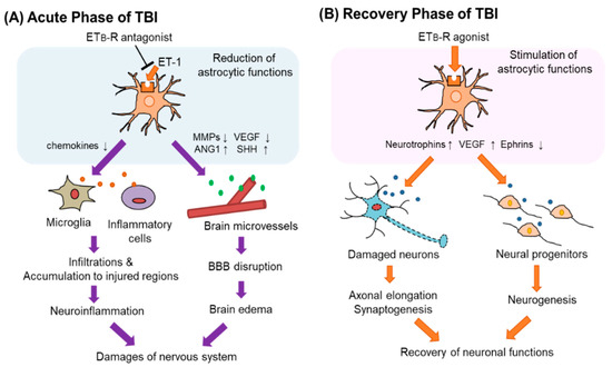 Astrocytic ETB-R as a therapeutic target of TBI. Astrocytic ETB-R may have different significance as a therapeutic target for patients with TBI in the acute and recovery phases. (A) In acute TBI, increased ET-1 increases the expression of MMPs and VEGF-A through the astrocytic ETB-R. It reduces angiopoietin-1 (ANG-1) and sonic hedgehog (SHH) production. Altered production of these vascular permeability regulators causes BBB disruption that induces brain edema. Stimulation of ETB-Rs also attracts inflammatory cells to the site of injury through increased production of chemokines. Administration of ETB-R antagonists in the acute phase of TBI reduces these astrocytic functions and may protect the nervous system. (B) In the recovery phase of TBI, the administration of ETB-R agonists is expected to be effective in recovering neuronal function impaired by TBI. Stimulation of astrocytic ETB-Rs promotes the production of neurotrophic factors, which promotes synaptogenesis and neurogenesis. ETB-R agonists also reduce the expression of ephrins. Then, regeneration of the damaged nervous system is promoted.