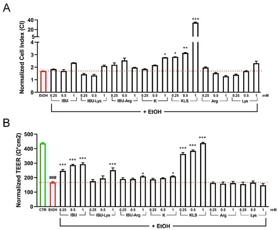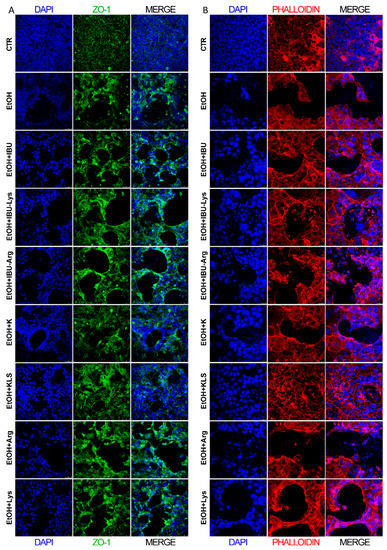 (A) Immunofluorescence of ZO-1 in Caco-2 cells after EtOH (6% for 24 h), EtOH + IBU, EtOH + IBU-Lys, EtOH + IBU-Arg, EtOH + K, EtOH + KLS, EtOH + Arg, and EtOH + Lys (1 mM) treatments for 72 h. ZO-1 (green), DAPI (nuclei, blue) Bar = 50 µm. (B) Immunofluorescence of phalloidin (red) staining in Caco-2 cells after EtOH (6% for 24 h), EtOH + IBU, EtOH + IBU-Lys, EtOH + IBU-Arg, EtOH + K, EtOH + KLS, EtOH + Arg, and EtOH + Lys (1 mM) treatments for 72 h. DAPI (nuclei, blue). Bar = 25 µm. n = 3, 5 fields/slide were examined, and a representative picture is shown.