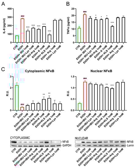 (A) Secreted levels of IL-8 on Caco-2 cells after EtOH (6% for 24 h), EtOH + IBU, EtOH + IBU-Lys, EtOH + IBU-Arg, EtOH + K, EtOH + KLS, EtOH + Arg, and EtOH + Lys treatments (1 mM) for 72 h by ELISA assay. (B) Secreted levels of TNFα on Caco-2 cells after EtOH (6%, for 24 h), EtOH + IBU, EtOH + IBU-Lys, EtOH + IBU-Arg, EtOH + K, EtOH + KLS, EtOH + Arg, and EtOH + Lys treatments (1 mM) treatments for 72 h by ELISA assay. Data are mean ± SD of 3 different experiments. (C) WB analysis for cytoplasmic and nuclear components of NFκB on Caco-2 cells after EtOH (6%, for 24 h), EtOH + IBU, EtOH + IBU-Lys, EtOH + IBU-Arg, EtOH + K, EtOH + KLS, EtOH + Arg, and EtOH + Lys treatments (1 mM) for 72 h. Data are mean ± SD of 3 different experiments. One way ANOVA was performed: ***, p < 0.0001; **, p < 0.005; *, p < 0.05 vs. EtOH; ###, p < 0.0001 EtOH vs. CTR.