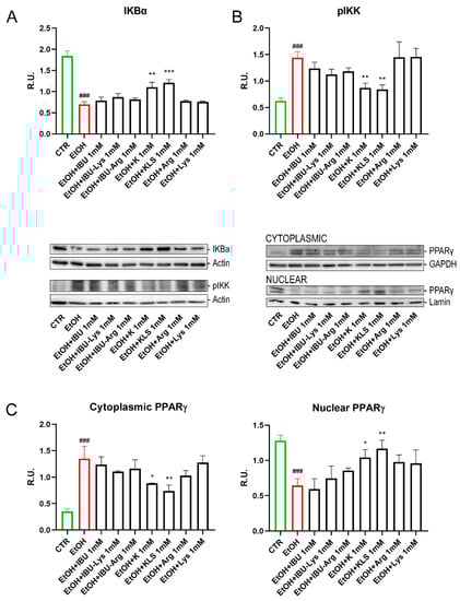 (A) WB analysis for IKBα (cytoplasmic and nuclear components) on Caco-2 cells after EtOH (6%, for 24 h), EtOH + IBU, EtOH + IBU-Lys, EtOH + IBU-Arg, EtOH + K, EtOH + KLS, EtOH + Arg, and EtOH + Lys treatments (1 mM) for 72 h. (B) WB analysis for the active form of IKK (pIKK) (cytoplasmic and nuclear components) on Caco-2 cells after EtOH (6%, for 24 h), EtOH + IBU, EtOH + IBU-Lys, EtOH + IBU-Arg, EtOH + K, EtOH + KLS, EtOH + Arg, and EtOH + Lys treatments (1 mM) for 72 h. Representative images of WB for IKBα, pIKK and PPARγ (cytoplasmic and nuclear components) are shown. (C) WB analysis for PPARγ (cytoplasmic and nuclear components) on Caco-2 cells after EtOH (6% for 24 h), EtOH + IBU, EtOH + IBU-Lys, EtOH + IBU-Arg, EtOH + K, EtOH + KLS, EtOH + Arg, and EtOH + Lys treatments at 1 mM for 72 h. Data are mean ± SD of 3 different experiments. One way ANOVA was performed: ***, p < 0.0001; **, p < 0.005; *, p < 0.05; vs. EtOH; ###, p < 0.0001 EtOH vs. CTR.