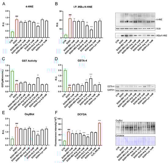 (A) WB analysis for 4-HNE on Caco-2 cells after EtOH (6% for 24 h), EtOH + IBU, EtOH + IBU-Lys, EtOH + IBU-Arg, EtOH + K, EtOH + KLS, EtOH + Arg, and EtOH + Lys treatments (1 mM for 72 h). Data are mean ± SD of 3 different experiments. (B) Immunoprecipitation for IKBα on Caco-2 cells after EtOH, EtOH + IBU, EtOH + IBU-Lys, EtOH + IBU-Arg, EtOH + K, EtOH + KLS, EtOH + Arg, and EtOH + Lys treatments (1 mM for 72 h). A representative western blot image is reported. (C) GST activity analyzed by ELISA assay on Caco-2 cells after EtOH (6% for 24 h), EtOH + IBU, EtOH + IBU-Lys, EtOH + IBU-Arg, EtOH + K, EtOH + KLS, EtOH + Arg, and EtOH + Lys treatments (1 mM for 72 h). (D) WB analysis for GSTA-4 on Caco-2 cells after EtOH (6% for 24 h), EtOH + IBU, EtOH + IBU-Lys, EtOH + IBU-Arg, EtOH + K, EtOH + KLS, EtOH + Arg, and EtOH + Lys treatments (1 mM for 72 h). A representative western blot image is reported. (E) OxyBlot assay to assess the intracellular oxidized protein on Caco-2 cells after EtOH (6% for 24 h), EtOH + IBU, EtOH + IBU-Lys, EtOH + IBU-Arg, EtOH + K, EtOH + KLS, EtOH + Arg, and EtOH + Lys treatments (1 mM for 72 h). A representative OxyBlot image is reported. (F) DCFDA assay of Caco-2 upon EtOH (6% for 24 h), EtOH + IBU, EtOH + IBU-Lys, EtOH + IBU-Arg, EtOH + K, EtOH + KLS, EtOH + Arg and EtOH + Lys treatments. Data are mean ± SD of 3 different experiments. One way ANOVA was performed: ***, p < 0.0001; **, p < 0.005; *, p < 0.05 vs. EtOH; ###, p < 0.0001 EtOH vs. CTR.