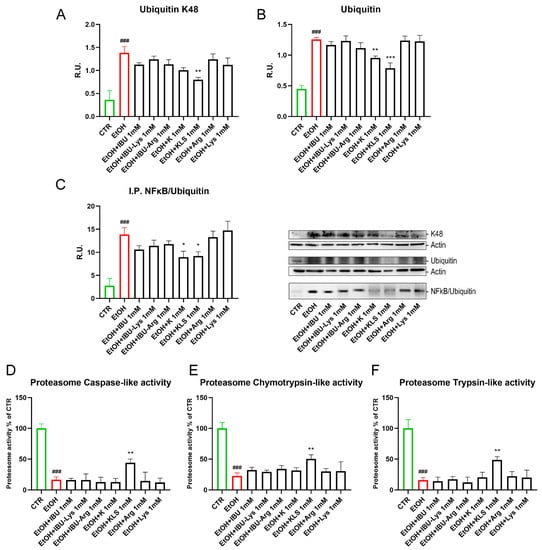 (A) WB analysis for ubiquitin K48 and (B) Ubiquitin on Caco-2 cells after EtOH challenge (6%, for 24 h), EtOH + IBU, EtOH + IBU-Lys, EtOH + IBU-Arg, EtOH + K, EtOH + KLS, EtOH + Arg, and EtOH + Lys treatments (1 mM for 72 h). (C) Immunoprecipitation for NFκB on Caco-2 cells after EtOH challenge (6%, for 24 h), EtOH + IBU, EtOH + IBU-Lys, EtOH + IBU-Arg, EtOH + K, EtOH + KLS, EtOH + Arg, and EtOH + Lys treatments (1 mM for 72 h). Data are mean ± SD of 3 different experiments. The image blot is a representative one. (D–F) Proteasome activities on Caco-2 cells after EtOH and NSAID treatments. Data are mean ± SD of 3 different experiments. One way ANOVA was performed: ***, p < 0.0001; **, p < 0.005; *, p < 0.05 vs. EtOH; ###, p < 0.0001 EtOH vs. CTR.