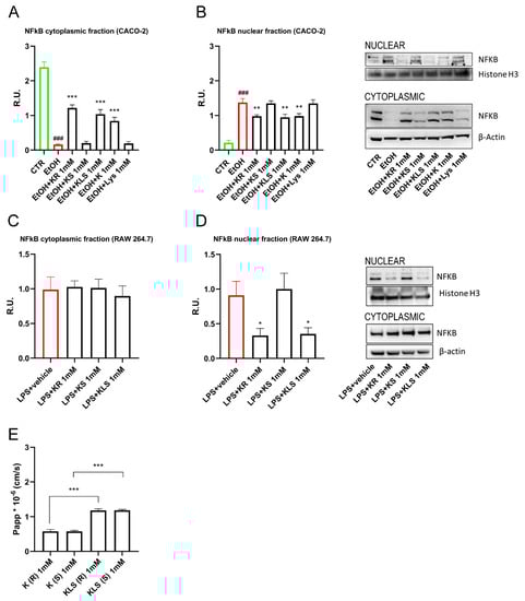 WB analysis for cytoplasmatic and nuclear components of NFκB (A,B) Caco-2 cells and (C,D) LPS-activated RAW 264.7 upon R or S enantiomer of K and K, KLS, Lys for 24 h. One way ANOVA was performed: ***, p < 0.0001; **, p < 0.005; *, p < 0.05; vs. EtOH; ###, p < 0.0001 EtOH vs. CTR. One-way ANOVA: * p < 0.05 vs. LPS vehicle (CTR) n = 3. The image blot is a representative one. (E) Permeability assay of Caco-2 cells upon R or S enantiomer of K, KLS. One-way ANOVA was performed: ***, p < 0.0001; **, p < 0.005 vs. EtOH. One-way ANOVA: * p < 0.05 vs. LPS vehicle (CTR) n = 3.