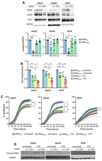 (A) Expression of EREG, EGFR, CAV1 and GAPDH was determined by Western blot in CAL27, CAL33 and SCC9 cells untransfected and transfected with siRNACtrl or siRNAEREG. Histograms represent the mean ± SEM (CAL27 and CAL33 n = 6–11 and SCC9 n = 6–13, with * p < 0.05 and *** p < 0.001) of the protein expression in siRNACtrl- or siRNAEREG-transfected cells normalized with GAPDH. (B) Histograms show the surviving fraction of CAL27, CAL33 and SCC9 cells transfected with siRNACtrl or siRNAEREG and treated with solvent or 30 nM CTX. Data represent the mean ± SEM surviving fraction at day 8 post-transfection and post-treatment (n = 4 with * p < 0.05, ** p < 0.01 and *** p < 0.0001). (C) Curves show the percentage of confluence after normalization to day 0 of CAL27, CAL33 and SCC9 cells transfected with siRNACtrl or siRNA EREG and treated with solvent or 30 nM CTX. Data are represented as the mean ± SEM (small dots) of confluence at 168 h post-transfection and post-treatment (CAL27 and CAL33 n = 4–5 and SCC9 n = 6–5 with * p < 0.05, ** p < 0.01 and *** p < 0.001). (D) Expression of cleaved PARP and GAPDH was determined by Western blot in CAL27, CAL33 and SCC9 cells transfected with siRNACtrl or siRNAEREG and treated with solvent or CTX (30 nM).