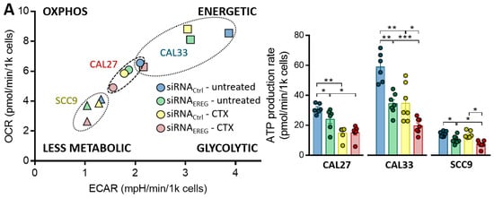 The metabolic reprogramming of cancer cells has a beneficial effect not only on tumor growth and survival but also on metastasis and chemoresistance. We therefore investigated how EREG might affect the mitochondrial metabolism. The ATP Rate assays reveal that all three cell lines exhibit different basal oxygen consumption (OCR), extracellular acidification (ECAR) and ATP production. CAL33 cells are the most energetic (Figure 2A, left). EREG-silencing significantly reduces OCR and ECAR (Figure 2A, right) and ATP production in all three cell lines, with the highest efficiency in the most energetic cell line, CAL33 (Figure 2A, right, with a 22 ± 3%, 41 ± 3% and 26 ± 1% inhibition in siRNAEREG-CAL27, siRNAEREG-CAL33 and siRNAEREG-SCC9, respectively). Although CTX significantly reduces the production of ATP in both siRNActrl- and siRNAEREG-transfected cells, SCC9 seem less sensitive to it (Figure 2A, right). EREG-silenced cells treated with CTX appear less metabolically active. Thus, silencing EREG and blocking EGFR with CTX cause mitochondria dysfunction, which is more important in highly metabolic cells.