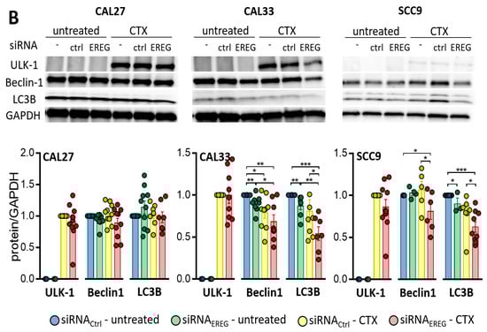 (A) Energetic map of CAL27, CAL33 and SCC9 cells transfected with siRNACtrl or siRNA EREG and treated with solvent or 30 nM CTX. Histograms show the ATP production of CAL27, CAL33 and SCC9 cells transfected with siRNACtrl or siRNAEREG and treated with solvent or 30 nM CTX. Data are represented as the mean ± SEM of ATP produced 144 h post-transfection and post-treatment (n = 8–9, with * p < 0.05, ** p < 0.001 and *** p < 0.0001). (B) Expression of ULK-1, Beclin1, LC3B and GAPDH was determined by Western blot in CAL27, CAL33 and SCC9 cells not transfected or transfected with siRNACtrl or siRNAEREG and treated with solvent or 30 nM CTX. Histograms represent the mean ± SEM (CAL27 n = 11, CAL33 n = 9 and SCC9 n = 10, with * p < 0.05, ** p < 0.01 and *** p < 0.001) of the protein expression normalized with GAPDH.