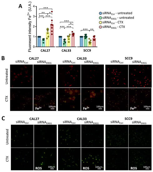 We next focused on ferroptosis, a different class of cell death, characterized by the accumulation of ferrous ions (Fe2+) and the increase in the production of lipid reactive oxygen species (ROS). The accumulation of Fe2+ was monitored using the FerroOrange probe. Silencing EREG significantly reduces Fe2+ staining in CAL27 and CAL33 cells (Figure 3A,B, with a 33 ± 5%, 43 ± 7% and 0 ± 5% inhibition in siRNAEREG-CAL27, siRNAEREG-CAL33 and siRNAEREG-SCC9, respectively). Although CTX does not affect Fe2+ accumulation in siRNActrl-cells, it significantly induces Fe2+ staining in siRNAEREG-transfected CAL27 and CAL33 without affecting SCC9 (Figure 3A,B). Lipid peroxides were monitored using the LiperFluo probe and revealed similar staining profiles to the ones observed in Figure 3B. Thus, silencing EREG reduces the accumulation of lipid peroxides in CAL27 and CAL33 cells (Figure 3C). Turning to CTX, it significantly induces lipid peroxides staining in siRNAEREG-transfected CAL27 and CAL33 without affecting SCC9 (Figure 3C). Altogether, EREG-silencing reprograms cells to induce ferroptosis in the presence of CTX.