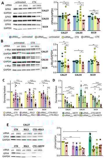 Expression of GPX4 and GAPDH (A) and c-Myc and GAPDH (B) was determined by Western blot in CAL27, CAL33 and SCC9 cells untransfected or transfected with siRNACtrl or siRNAEREG and treated with solvent or 30 nM CTX. Histograms represent the mean ± SEM (CAL27 and CAL33 n = 10 and SCC9 n = 9, with * p < 0.05, ** p < 0.01 and *** p < 0.001) of the protein expression normalized with GAPDH. (C) Histograms show the surviving fraction of CAL27, CAL33 and SCC9 cells transfected with siRNACtrl or siRNAEREG and treated with 30 nM CTX, 5 µM RSL3 or a combination of both. Data represent the mean ± SEM surviving fraction at day 8 post-transfection and post-treatment (n = 4, with *** p < 0.0001). (D) Histograms show the surviving fraction of CAL27, CAL33 and SCC9 cells transfected with siRNACtrl or siRNAEREG and treated with 30 nM CTX, 1 mM metformin (METF) or a combination of both. Data represent the mean ± SEM surviving fraction at day 8 post-transfection and post-treatment (n = 4, with ** p < 0.01 and *** p < 0.0001). (E) Expression of GPX4 and GAPDH was determined by Western blot in CAL27 transfected with siRNACtrl or siRNAEREG and treated with 30 nM CTX, 5 µM RSL3 or a combination of both (upper panel) or with 30 nM CTX, 1 mM metformin (METF) or a combination of both (lower panel). Histograms represent the mean ± SEM (n = 4, with * p < 0.05, ** p < 0.01 and *** p < 0.001) of the protein expression normalized with GAPDH.