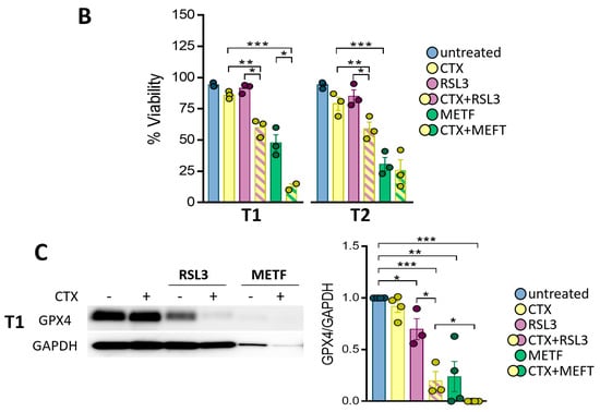 Finally, the exposure of tumoroids to CTX does not affect GPX4 expression (Figure 5C). GPX4 is significantly reduced by RSL3 alone (30 ± 10%) and even further when RSL3 is combined with CTX (80 ± 9%). Similar results were obtained in T2 and T3 (data not shown). It is also significantly reduced by metformin alone (76 ± 14%) and totally lost when metformin is combined with CTX (Figure 5C). Altogether, the data confirm the efficacy of targeting xCT and GPX4 in CTX-resistant tumors.