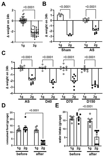 The body weight gain, expressed as the difference in weight in a 24 h period (Figure 1), is the difference in body weight measured before and after exposure to centrifugation (2× g) or control conditions (1 g). As expected, the exposure to centrifugation induced a decrease in body weight (Figure 1A, p < 0.0001).