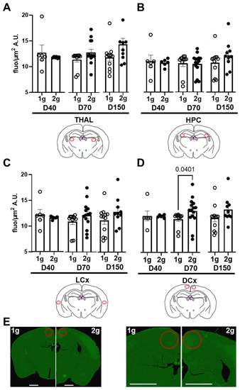 The centrifugation was not able to modify the fluorescent levels in THAL (Figure 3A, Mann–Whitney tests comparing 1 g vs. 2 g conditions for D40, p = 0.93; for D70 p = 0.29 and for D150 p = 0.069), HPC (Figure 3B, Mann–Whitney tests comparing 1 g vs. 2 g conditions for D40 p = 0.53; for D70 p = 0.76 and for D150 p = 0.089) and LCx (Figure 3C, Mann–Whitney tests comparing 1 g vs. 2 g conditions for D40 p = 0.50; for D70 p = 0.08 and for D150 p = 0.16). In DCx, the hypergravity can increase the level of fluorescence only in D70 (Mann–Whitney tests comparing 1 g vs. 2 g conditions for D40 p = 0.051; for D70 p = 0.040 and for D150 p = 0.050; Figure 3D). The differences in D70 fluorescence across brain sections are illustrated in Figure 3E. More marked fluorescence diffusion is observed in the DCx of 2 g-exposed mice. In conclusion, these sets of data analysis suggested that centrifugation significantly increased the presence of D70 in DCx.