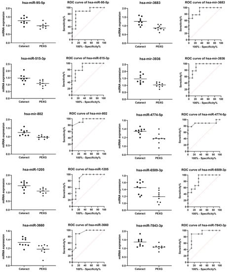 Ten miRNAs were downregulated in PEXG (hsa-miR-95-5p, hsa-miR-515-3p, hsa-mir-802, hsa-miR-1205, hsa-miR-3660, hsa-mir-3683, hsa -mir-3936, hsa-miR-4774-5p, hsa-miR-6509-3p, and hsa-miR-7843-3p) (Table 2, Figure 1) and ten miRNAs were upregulated in PEXG (hsa-miR-202-3p, hsa-miR-3622a-3p, hsa-mir-4329, hsa-miR-4524a-3p, hsa-miR-4655-5p, hsa-mir-6071, hsa-mir-6723-5p, hsa-miR-6847-5p, hsa-miR-8074, and hsa-miR-8083) (Table 3, Figure 2).