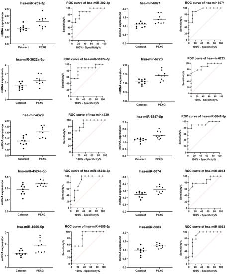 In the group of DEG’s miRNAs whose expression was higher in PEXG compared to the group (p < 0.01; AUC > 0.840; p < 0.01), a mean increase in the level of PEXG expression was found at the level of 28.73% for hsa-miR-202-3p, 29.65% for hsa-miR-3622a-3p, 20.05% for hsa-mir-4329, 21.64 for hsa-miR-4524a-3p, 34.06% for hsa-miR-4655 -5p, 23.50% for hsa-mir-6071, 24.61% for hsa-mir-6723-5p, 24.30% for hsa-miR-6847-5p, 21.57% for hsa-miR-8074, and 23.06% for hsa-miR-8083.