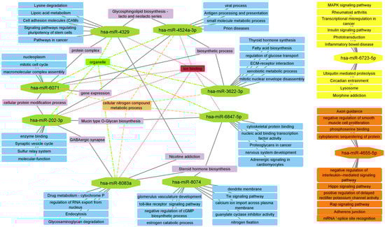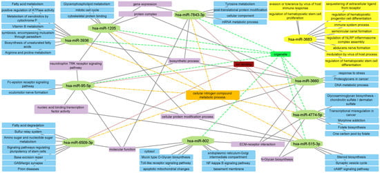 Using the DIANA miRPath v3.0 database, a functional analysis of each of the selected miRNAs was performed (the analysis was performed separately for miRNAs with reduced and increased expression in PEXG). Next, networks were constructed visualizing possible functional relationships between the selected miRNAs (Figure 3 and Figure 4).