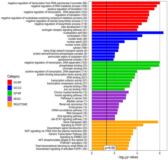 Top 10 terms of the Gene Ontology (GO): Biological Processing (GO:BP), GO: Cellular Compartment (GO:CC), Molecular Function (GO:MF), REACTOME and KEGG (Kyoto Encyclopedia of Genes and Genomes) categories, revealed for glaucoma- and/or pseudoexfoliation syndrome (PEX)-associated genes targeted by downregulated miRNAs found in the current study in the aqueous humor (AH) of patients with PEXG and age-matched controls. p-value—EASE score for enrichment adjusted by the Benjamini correction for multiple-hypothesis testing. The number in brackets following the names of terms indicates the number of associated genes. The plot was generated using the ggplot2 3.3.0 package in the R environment.
