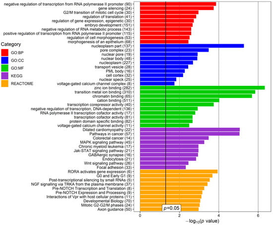 Top 10 terms of the Gene Ontology (GO): Biological Processing (GO:BP), GO: Cellular Compartment (GO:CC), Molecular Function (GO:MF), REACTOME, and KEGG (Kyoto Encyclopedia of Genes and Genomes) categories, revealed for glaucoma- and/or pseudoexfoliation syndrome (PEX)-associated genes targeted by upregulated miRNAs found in the current study in the aqueous humor (AH) of patients with PEXG and age-matched controls. p-value—EASE score for enrichment adjusted by the Benjamini correction for multiple-hypothesis testing. The number in brackets following the names of terms indicates the number of associated genes. The plot was generated using the ggplot2 3.3.0 package in an R environment.