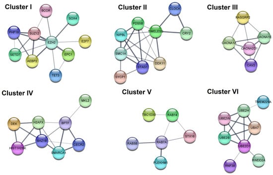 A PPI network of the genes regulated by selected miRNAs were constructed and clustering analysis was performed based on these PPI networks. In total, six clusters (sub-networks) were created for each PPI network of the genes regulated by downregulated miRNAs (Figure 7, Table 4). Clusters I and IV are functionally related to chromatin organization and epigenetic regulation of gene expression, moreover, the key genes in them are the EZH2 gene (in cluster I) and BAZ1B (in cluster IV). Cluster II is functionally related to nuclear chromosome segregation and cellular response to DNA damage (the key gene: TIMELESS). Cluster III is functionally related to the voltage-gated calcium channel complex and MAPK signaling pathway (the key gene: CACNA2D1). Cluster V is functionally related to protein transport (the key gene: RAB7A). Cluster VI is functionally related to ubiquitinization (the key gene: UBE2D1).