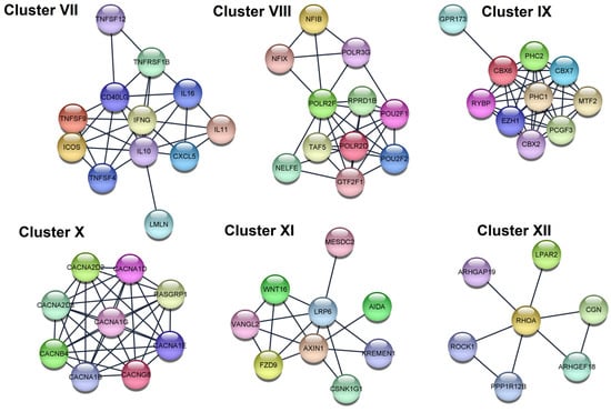 In total, six clusters (sub-networks) were created for each PPI network of the genes regulated by upregulated miRNAs (Figure 8, Table 5). Cluster VII is functionally related to cytokine-cytokine receptor interaction and cell–cell adhesion (the key gene: IL10). Cluster VIII is functionally related to the activity of RNA polymerases II and III (the key gene: PLR2D). Cluster IX is functionally related to ubiquitinization (the key gene: PHC1). Cluster X is functionally related to L-type voltage-gated calcium channel complex (the key gene: CACNA1G). Cluster XI is functionally related to the regulation to the jnk cascade (the key gene: AXIN1). Cluster XII is functionally related to Rho GTPases activate ROCKs and phospholipase D signaling pathway (the key gene: RHOA).