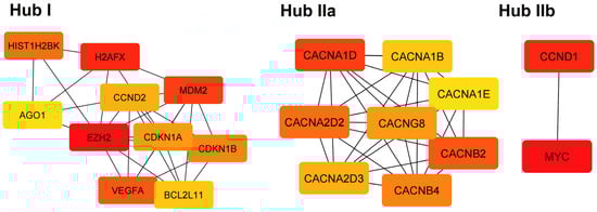 The PPI hub gene modules from PPI networks of the genes regulated by downregulated (Hub I) and upregulated miRNAs (Hubs IIa, IIb).