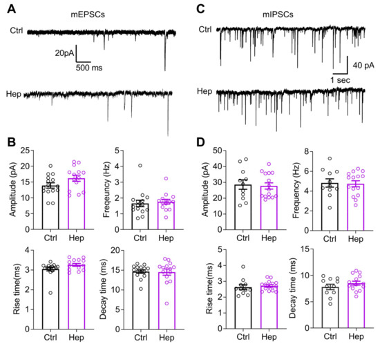 Having found that heparinase treatment in vitro can up-scale mEPSCs, we measured glutamatergic transmission (mEPSC) and GABAergic transmission (mIPSC) to CA1 pyramidal neurons 1 day after heparinase injection in vivo. Unexpectedly, we did not observe changes in the mEPSCs’ amplitude or frequency (Figure 2A,C). Additionally, temporal parameters such as the rise and decay times were not affected (Figure 2A,C). The properties of mIPSCs were also unchanged by heparinase treatment (Figure 2B,D).