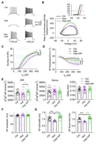 CaMKII inhibitor (AIP) could rescue reduced neuronal excitability of CA1 pyramidal neurons after heparinase (Hep) injection in vivo. (A) Sample traces of action potentials (APs) elicited by depolarizing current injections in the CA1 pyramidal cells. (B) Phase plot (dV/dt versus V) of the first action potential in response to 300 pA current injection. Inset (left) shows the initial phase of the action potential from the phase plot (right). (C,D) Summary graphs showing the number of action potentials elicited by different depolarizing current injections and the AP threshold at 20 mV/ms in response to different current injections. * p < 0.05, *** p < 0.001, Holm–Sidak test after two-way RM ANOVA. (E) Analysis of the amplitude and interval (Delay) between two peaks of the second action potential derivative (d2/dt2 AP), which correspond to the activation of sodium channels in the AIS and soma, revealed facilitated AP generation at the AIS after heparinase treatment with co-administration of AIP. * p < 0.05, Holm–Sidak test after one-way ANOVA. (F,G) Summary graphs comparing Ctrl (heat-inactivated heparinase), heparinase, and heparinase+AIP-injected neurons in terms of the amplitude (F), half-width (G), and decay time (G) of the action potential (Ctrl, n = 22; Hep, n = 17; Hep+AIP, n = 10; *** p < 0.05, Holm–Sidak test after one-way ANOVA). Data are presented as means ± SEMs.