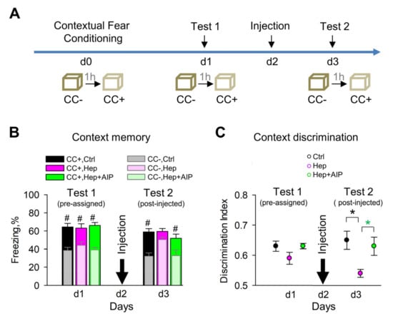In our previous study, we found that heparinase injected before contextual fear conditioning did not affect the level of spontaneous freezing/immobility before conditioning but impaired context discrimination 24 h after conditioning [19]. This experiment, however, did not allow us to dissect whether HSHSs are essential for the acquisition, consolidation, or recall of contextual memories because re-expression of glycans is a slow process taking several weeks [25], and hence the removal of HSHSs before conditioning would result in impaired HSHS expression during acquisition, consolidation, and recall of memories for the next few days after conditioning. In the present study, we specifically tested if HSHSs are necessary for proper contextual memory recall by injecting heparinase on day 2 after contextual fear conditioning (Figure 5a), i.e., after the acquisition and consolidation of memories were successfully completed. This was confirmed by normal freezing time in the conditioned context and normal context discrimination on day 1 in mice pre-assigned to all experimental groups, i.e., control, heparinase, and heparinase plus AIP (Figure 5A). Additionally, on day 3 after conditioning, i.e., 24 h after heparinase injection, the freezing time in the conditioned context was normal in the control group, but heparinase-treated mice showed increased freezing in the neutral context CC- (Figure 5B) and impaired contextual discrimination (Figure 5C). Co-administration of AIP restored normal context discrimination after heparinase treatment, not affecting freezing time in the conditioned context.