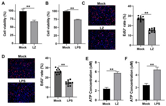 G. parasuis LPS enhanced the mortality and the ATP level of PAM cells. (A,B) Quantification of mortality. PAM cells were treated with G. parasuis LZ (A) and 50 μg/mL LPS (B) for 8 h, and cell viability was measured by CCK-8. (C,D) Representative images of cell proliferation were determined by EdU cell proliferation assay, and quantification of EdU+ cell. n = 10. (E,F) ATP levels in PAM cells. After PAM cells were affected with G. parasuis at MOI = 10 for 8 h, PAM cells were lysed and the cell lysates were analyzed for ATP levels. Data represent mean ± SEM, n = 3, ** p < 0.01.